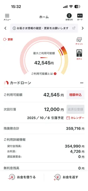 | ご利用したカードローン・キャッシングの良い点 | いつでも返済と借入ができる。アプリで現在の借入状況などが一目でわかる。引き落とし日などの「お知らせ」がしっかり来るので入金忘れがない。 | ||