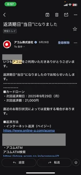 返済日にメールが来て、返済に遅れるとメールと電話がきます。