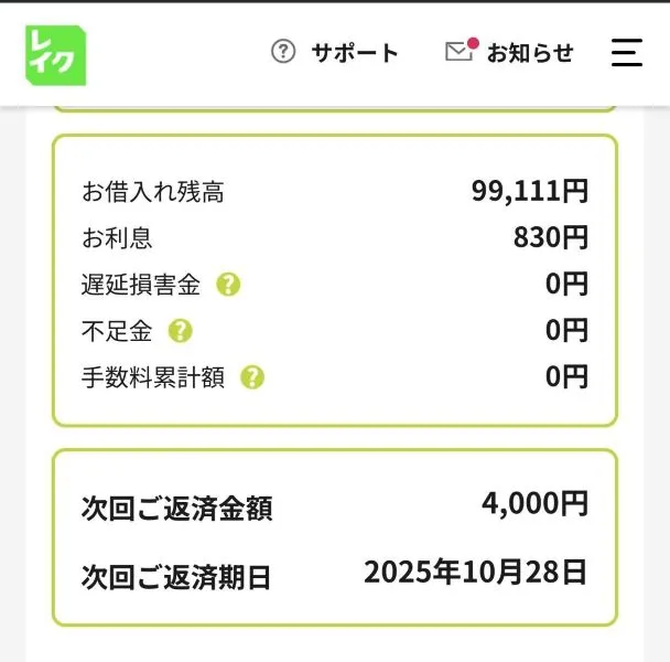 | 申込時のコンタクト | 電話(携帯) | 遅延時のコンタクト | 遅延なく返済 |