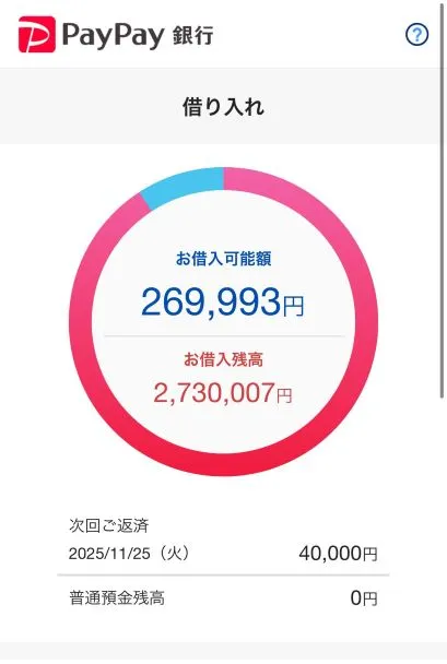 | このカードローン・キャッシングに決めた理由 | 普段使っているネットバンクの口座なので、日常的に使っていることもあり、利便性が良いのでPayPay銀行にした。 | ||