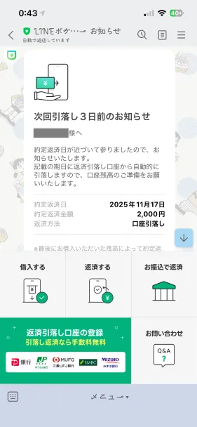| このカードローン・キャッシングに決めた理由 | 少額からでも借りられますし、まとまった金額を借りたい人にも対応しています。LINEのアプリ上で手軽に操作できるところが決め手でした。 | ||