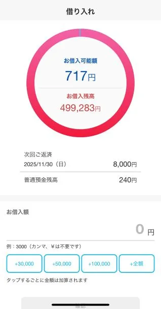 | ご利用したカードローン・キャッシングの悪い点 | 50万円借りて、月8,000円返してますが、数百円しか返済した事にならないので、返済終わりがの終わりが見えない部分があります。たとえば、今のペースだとあと何年何カ月で返済できるなど、分かりやすくしてもらえたらいいなと思いました。あとサブスクの金額が勝手にローンから引かれていたことがありびっくりしました。 | ||