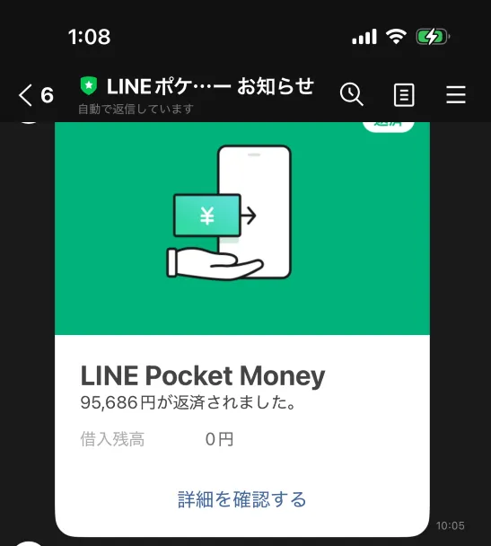 | このカードローン・キャッシングに決めた理由 | 急な出費があって借入を検討していたところ、LINEポケットマネーを見つけました。LINEのみで完結するとの事で借入までの申込が楽そうだったのと、わざわざ専用アプリを入手する手間が無いので気楽に利用できました。 | ||
