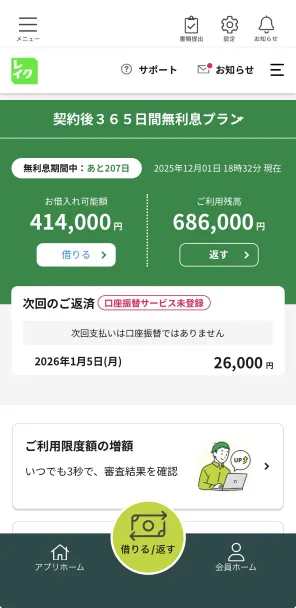 | ご利用したカードローン・キャッシングの悪い点 | 私の場合オンラインで完結してしまったので、契約書の在りかや繰り上げ返済に関することなど、実際にやってみたり聞いたりしないと分からないようなことは大変でした。レイクは返済日の2週間前から返済可能なのですが、私の勘違いで2週間と1日前に多額の返済をしてしまったことがあります。そうなると、返済日に対する返済はされていないことになってしまうので、私がした多額の返済は繰り上げ返済という扱いになります。その月に返済する予定をやや上回って返してしまったので、のちの返済計画を少し調整する必要がありました。このように、オンライン完結アプリ完結だと指示のないことは分かりにくいので、せめて返済日に返済を行う意味や、今回の返済は繰り上げ返済となる旨などを記載してもらえるとなお良かったと思います。 | ||
