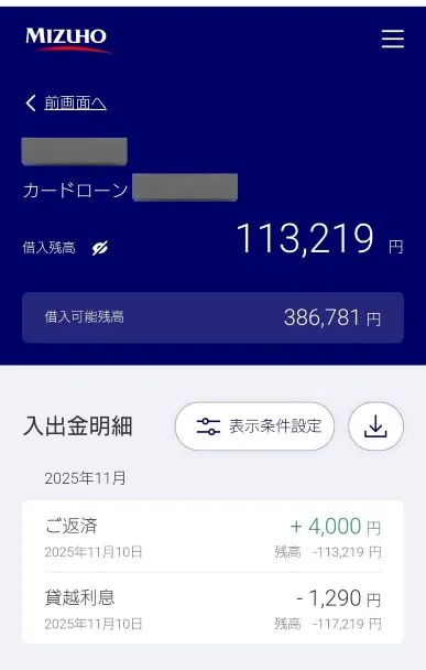 | このカードローン・キャッシングに決めた理由 | みずほ銀行の口座を持っていたので、手続きが終ると早く終わると思ったため。審査も早そうで、すぐに借りられると思ったからです。 | ||