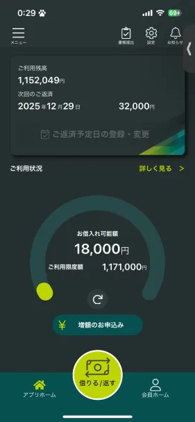 | ご利用したカードローン・キャッシングの良い点 | アプリで借りたり返したりの作業ができること。ATMに行かずにすべて済ませられるし、ATMから直接借りることもできる。 | ||