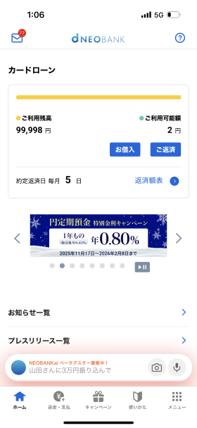 - 住信SBIネット銀行カードローン 借入当時の画像の為、現在の画面と異なる場合があります。