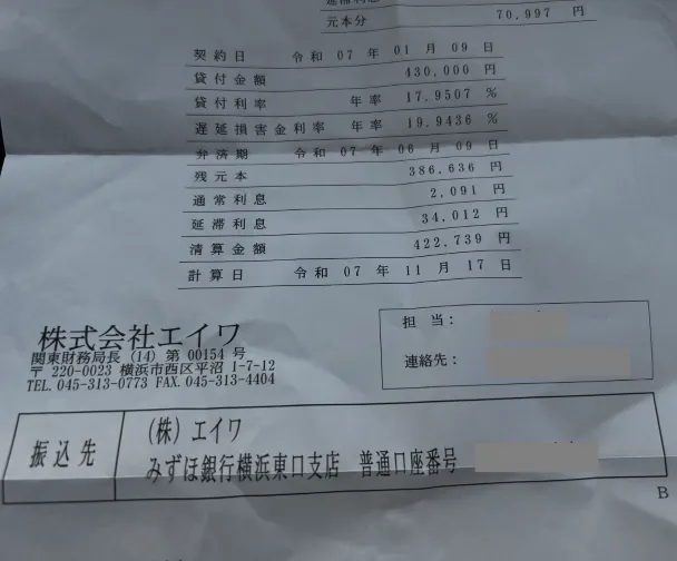 | 借入金額 | 43万円 | 利息 | 年17.95% |