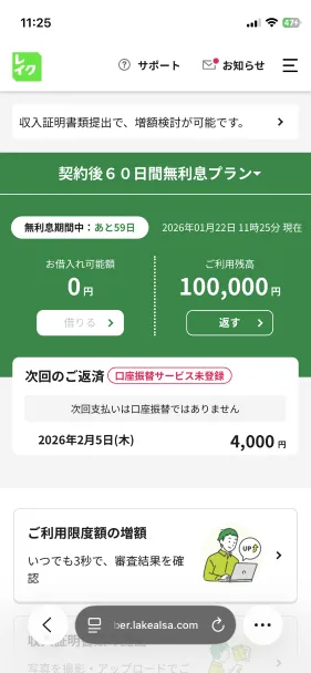 - レイク 口座振込による借入は原則として銀行営業時間内に限られます。