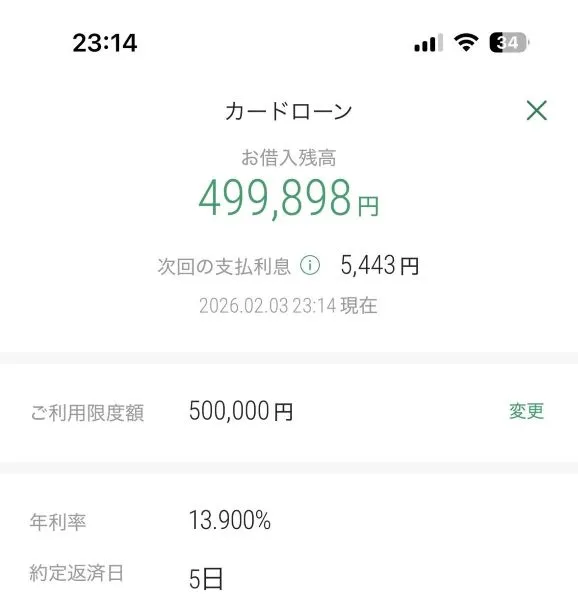 | 借入金額 | 50万円 | 利息 | 年14.0% |