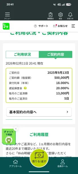 | 借入金額 | 50万円 | 利息 | 年18.0% |