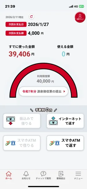 | 借入金額 | 4万円 | 利息 | 年18.0% |