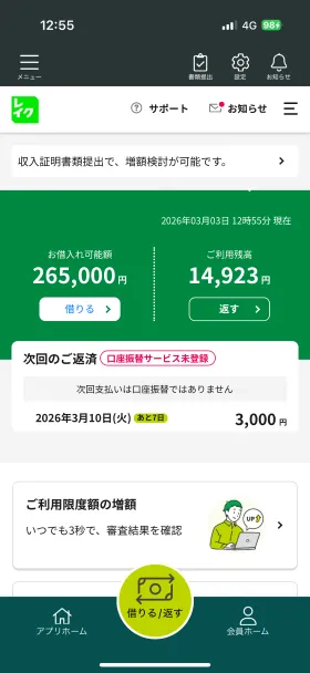 | ご利用したカードローン・キャッシングの悪い点 | アプリの操作中に読み込み時間が長くなることが少しだけ気になりました。通信環境によるものかもしれませんが、その点のみ改善の余地があると感じています。 | ||