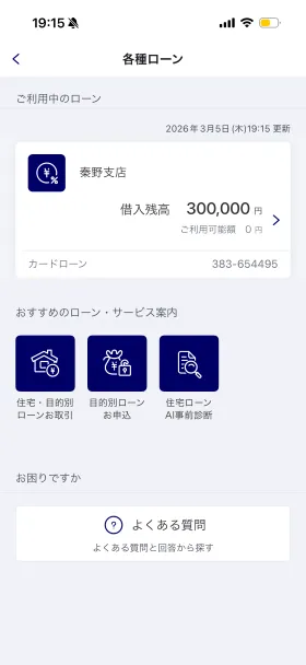 | ご利用したカードローン・キャッシングの良い点 | 他社より低金利で、アプリから手軽に返済できる点が便利です。また、銀行のローンということで、個人情報の取り扱いを含め高い安心感があることも魅力です。 | ||