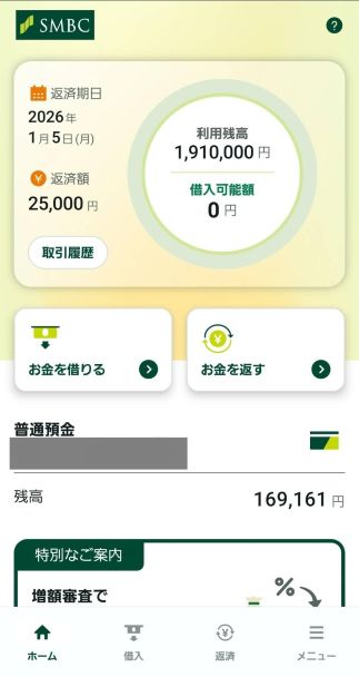 | このカードローン・キャッシングに決めた理由 | どうしても大きなお金が必要になり、そもそも利用している三井住友銀行のカードローンにしました。アプリが使いやすそうだった。 | ||